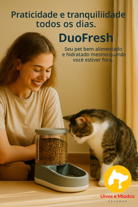O DuoFresh é um comedouro duplo com base elevada desenvolvido para oferecer maior conforto durante a alimentação de cães e gatos. Com dois recipientes separados, permite servir ração e água simultaneamente.